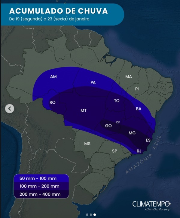 Uma nova atuação da Zona de Convergência do Atlântico Sul (ZCAS) está prevista entre os dias 19 e 23 de janeiro, marcando o segundo episódio do fenômeno no Brasil em 2026. A formação deve garantir um período de chuvas persistentes e volumosas sobre várias regiões brasileiras.De acordo com informações meteorológicas, os maiores acumulados de chuva estão previstos para a Zona da Mata Mineira, Vale do Rio Doce, Espírito Santo e regiões Norte e Noroeste do Rio de Janeiro. Em áreas de Minas Gerais e de Goiás, os modelos indicam volumes entre 200 mm e 400 mm em apenas cinco dias, valor que, em algumas cidades, se aproxima da média histórica de precipitação para todo o mês de janeiro.