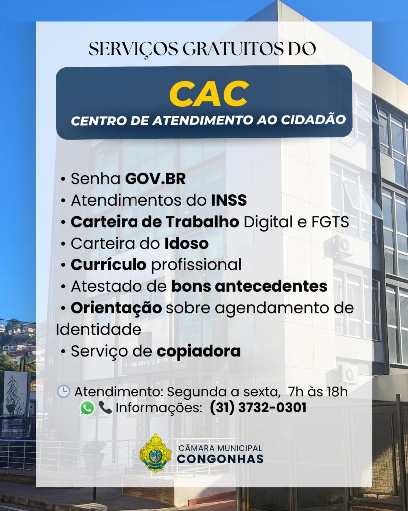 O Centro de Atendimento ao Cidadão (CAC) oferece gratuitamente diversos serviços à população de Congonhas, garantindo mais acesso a documentos, informações e atendimentos essenciais.