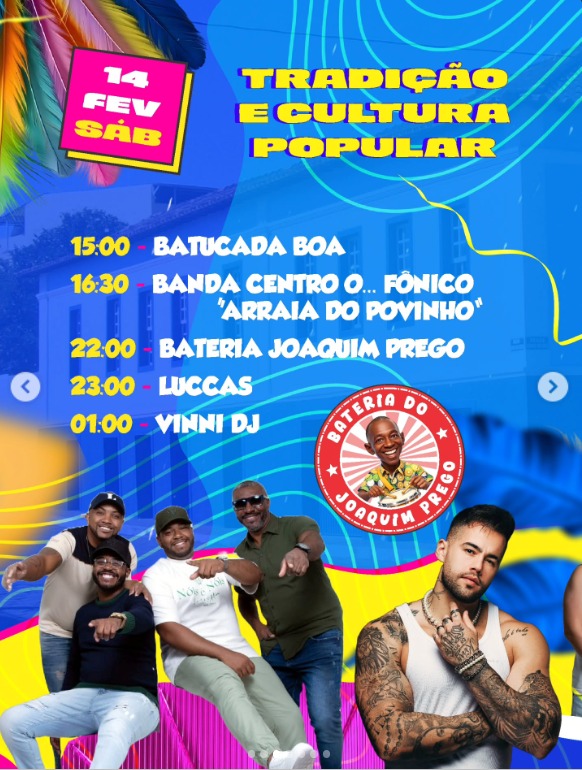 • Sábado (14/02) – Tradição e Cultura Popular: O dia conta com Batucada Boa (15:00), Banda Centro O…fônico com o “Arraiá do Povinho” (16:30), Bateria do Joaquim Prego (22:00), Luccas (23:00) e Vinni DJ (01:00).