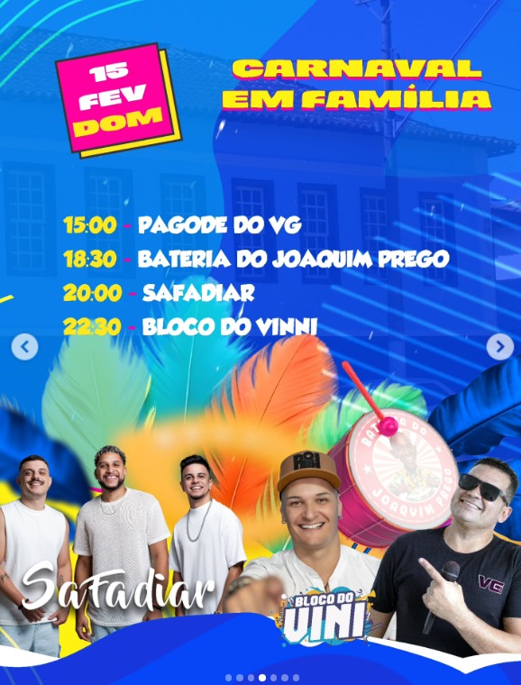 • Domingo (15/02) – Carnaval em Família: A diversão continua com Pagode do VG (15:00), Bateria do Joaquim Prego (18:30), Safadiar (20:00) e Bloco do Vinni (22:30).