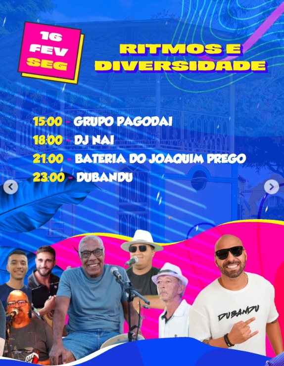 • Segunda-feira (16/02) – Ritmos e Diversidade: Muita variedade com Grupo Pagodai (15:00), DJ Nai (18:00), Bateria do Joaquim Prego (21:00) e Dubandu (23:00).