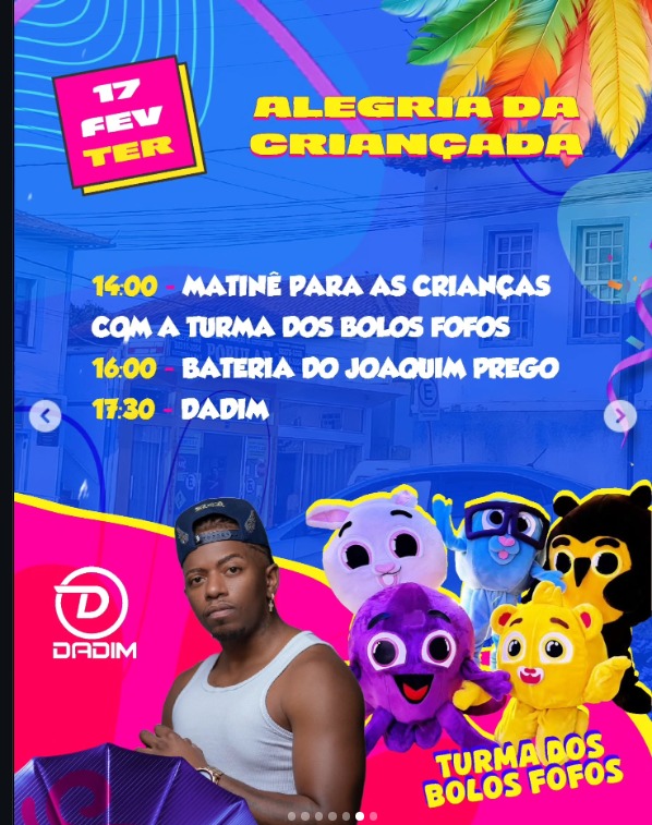 • Terça-feira (17/02) – Alegria da Criançada: O último dia é dedicado aos pequenos com uma Matinê às 14:00 apresentando a Turma dos Bolos Fofos. O encerramento fica por conta da Bateria do Joaquim Prego (16:00) e show do Dadim (17:30). A foilia encerra às 22:00 horas.