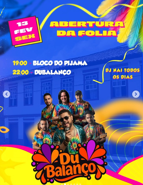 • Sexta-feira (13/02) – Abertura da Folia: A festa começa às 19:00 com o Bloco do Pijama, seguido pelo show da banda Dubalanço às 22:00.