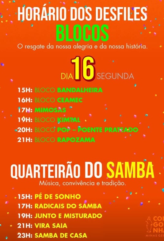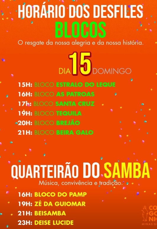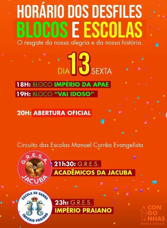 “Teremos um carnaval de altíssimo nível, com organização, segurança, inclusão, valorização dos artistas locais e, pela primeira vez na história de Congonhas, cinco escolas de samba desfilando. É um feito coletivo e um orgulho para a cidade”, afirmou o prefeito.