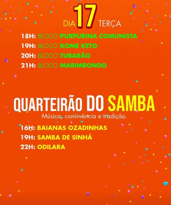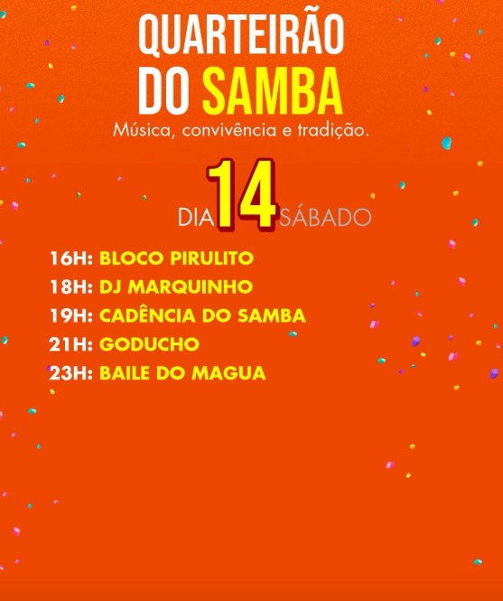 A programação contará com três palcos, desfiles das escolas de samba, blocos, atrações locais e nacionais, além de espaços pensados para pessoas com deficiência, famílias e públicos diversos.