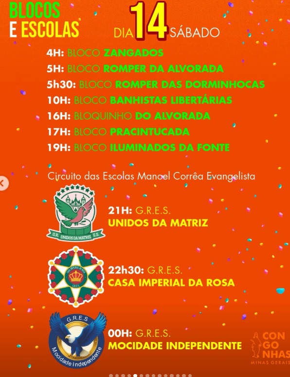 A programação completa está disponível no Instagram oficial da Prefeitura: @prefeituradecongonhas