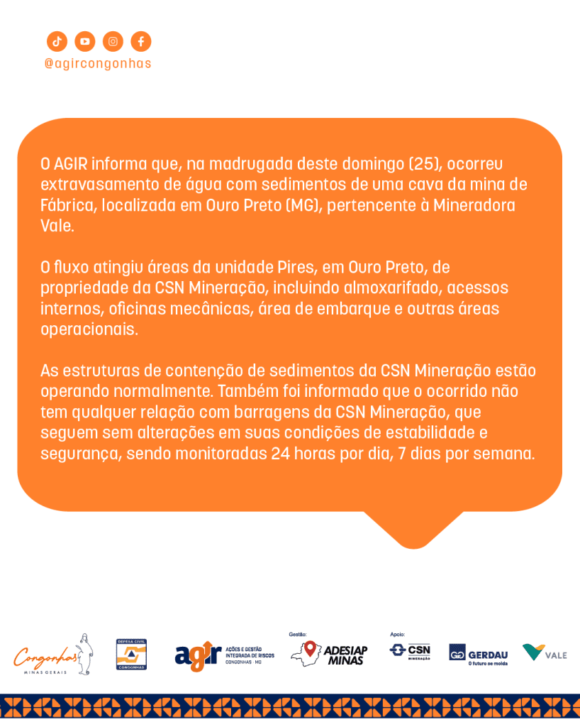 O AGIR informa que, na madrugada deste domingo (25), ocorreu extravasamento de água com sedimentos de uma cava da mina de Fábrica, localizada em Ouro Preto (MG), pertencente à Mineradora Vale.O fluxo atingiu áreas da unidade Pires, em Ouro Preto, de propriedade da CSN Mineração, incluindo almoxarifado, acessos internos, oficinas mecânicas, área de embarque e outras áreas operacionais.