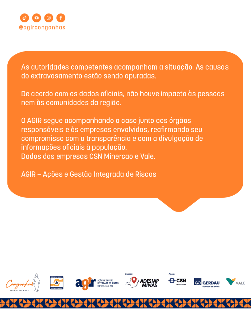 As estruturas de contenção de sedimentos da CSN Mineração estão operando normalmente. Também foi informado que o ocorrido não tem qualquer relação com barragens da CSN Mineração, que seguem sem alterações em suas condições de estabilidade e segurança, sendo monitoradas 24 horas por dia, 7 dias por semana.As autoridades competentes acompanham a situação. As causas do extravasamento estão sendo apuradas.