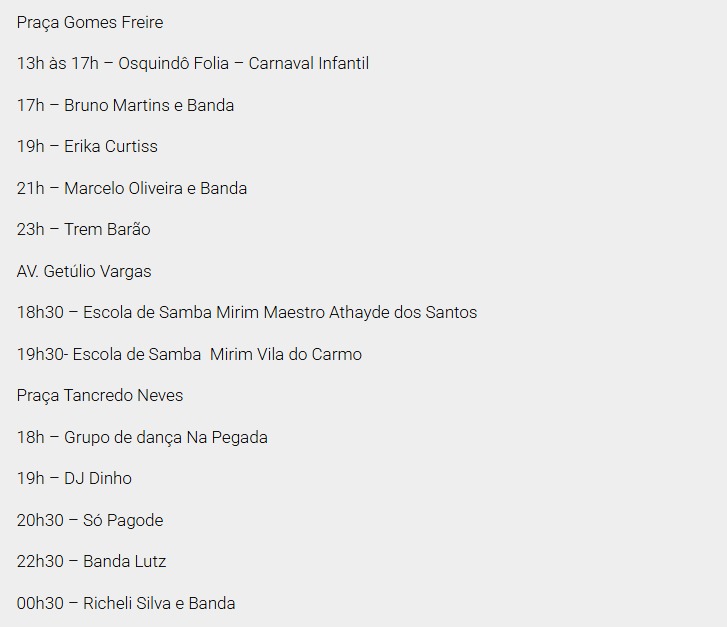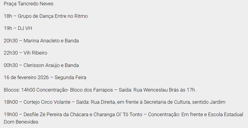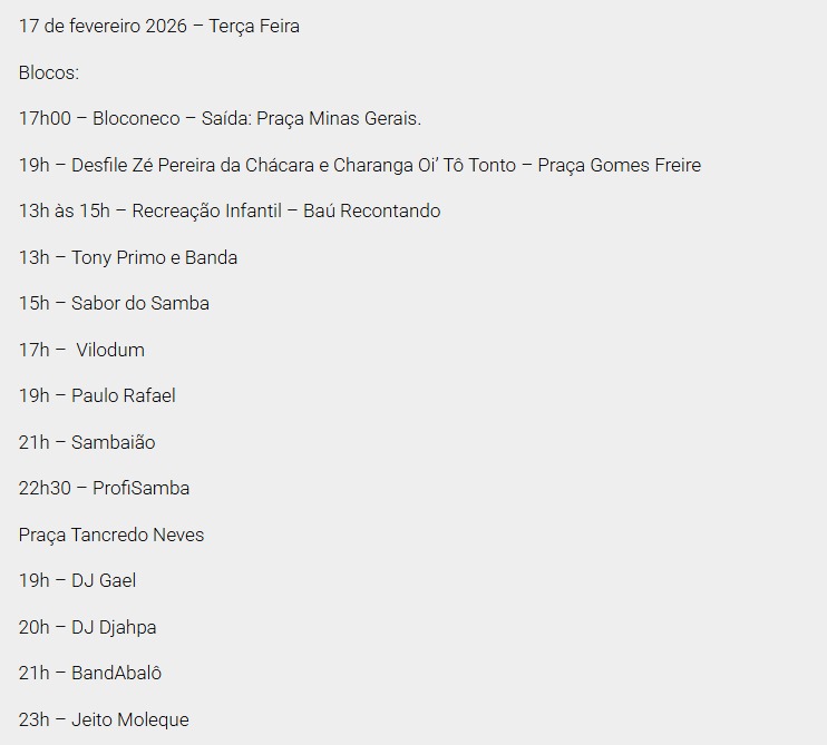A programação do Carnaval de Mariana 2026 conta ainda com apresentações de seus tradicionais blocos carnavalescos, como a Banda do Farrapos e o Folia Nossa, além das escolas de samba e de artistas de renome nacional, como Jeito Moleque e Deu Samba.
