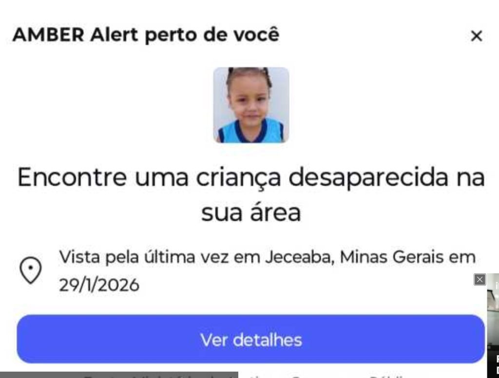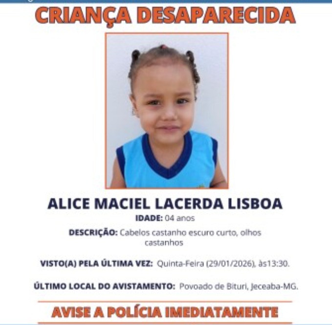 Minas Gerais – A empresa de tecnologia Meta, responsável por plataformas como Instagram e Facebook, disparou na tarde desta sexta-feira (30) alertas urgentes sobre o desaparecimento da menina Alice Maciel Lacerda Lisboa, de apenas 4 anos, no interior de Minas Gerais. Alice desapareceu na tarde de quinta-feira (29), por volta das 14h30, no distrito de Bituri, zona rural do município de Jeceaba, na Região Central do estado. A ação faz parte do programa internacional Amber Alert, sistema de alerta rápido utilizado em casos de desaparecimento de crianças, já adotado no Brasil. Os avisos estão sendo enviados para usuários que se encontram em um raio de até 160 quilômetros do local do desaparecimento, com o objetivo de mobilizar a população e acelerar a localização da criança.