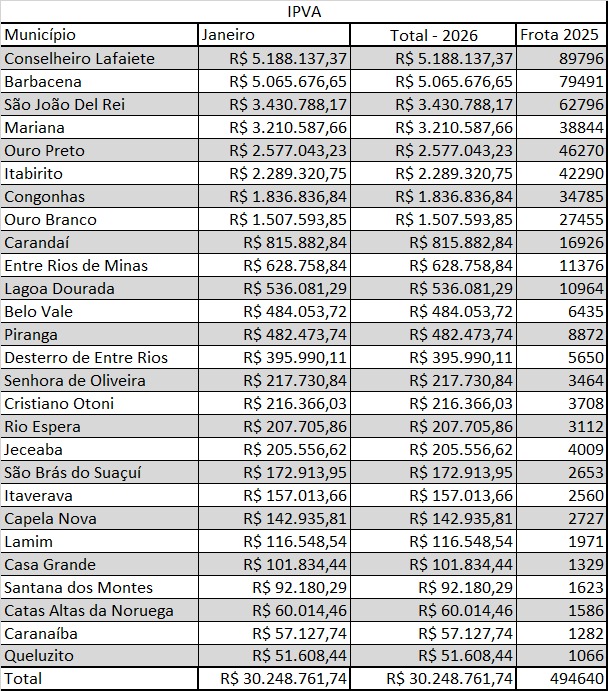 Com quase 90 mil veíuculos, Lafaiete é disparada a que mais arrecadou recursos do IPVA em janeoiro mais de R$5.118 milhões, seguida por Barbacena (R$5.065 mlhões), São João Del Rei com R$3.430 milhões, Mariana com R$3.210 milhões, Ouro Preto (R$2.577 milhões0, Itabirito com R$ 2.289 milhões, Congonhas (R$1.836 milhões) e Ouro Branco com R$ 1.507 milhões.