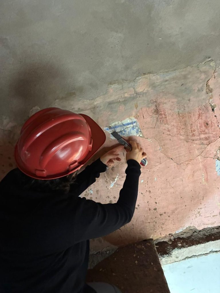 Durante a vistoria, foram discutidas as etapas em andamento e as próximas ações da obra, assegurando que todas as intervenções sigam as boas práticas de restauro, com técnicas adequadas e materiais compatíveis com a estrutura original. Entre os procedimentos técnicos realizados, destaca-se a prospecção estratigráfica, método que consiste na remoção minuciosa das camadas de tinta aplicadas ao longo dos anos para identificar a pintura original da estação. Apesar de parecer simples, a técnica é fundamental para recuperar as cores e características autênticas do imóvel, contribuindo para a fidelidade histórica do restauro.