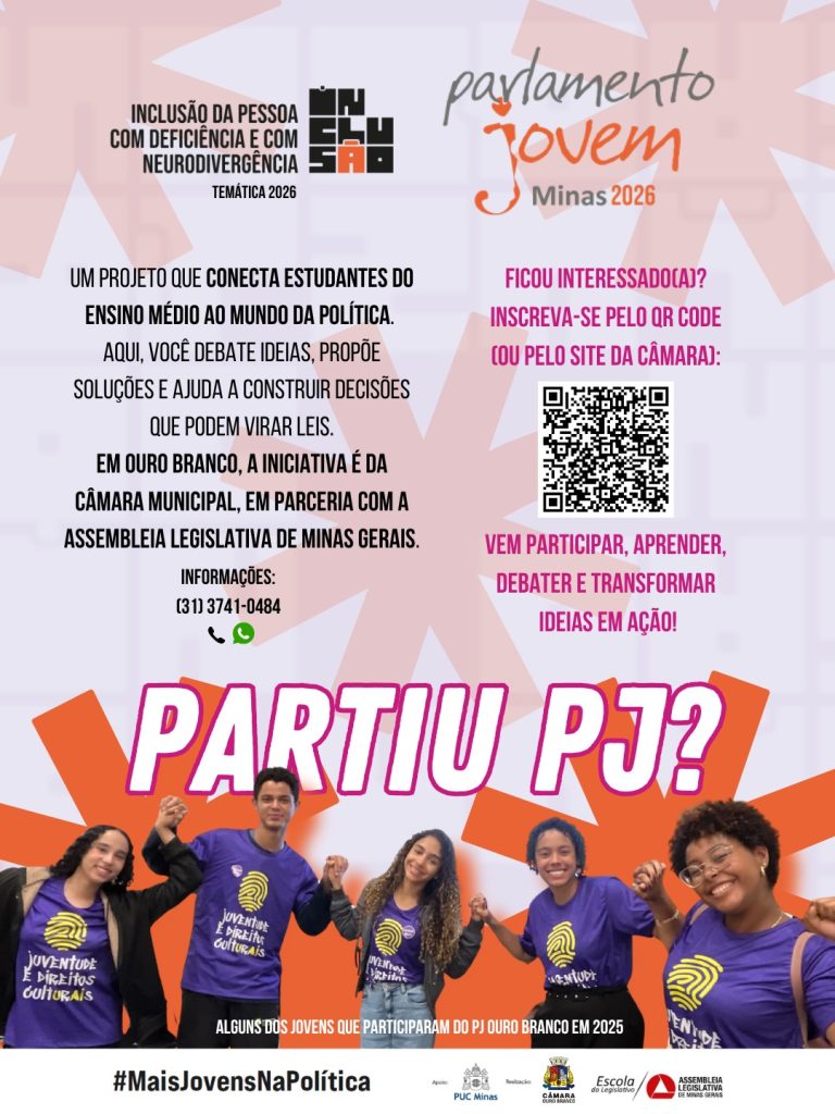 As inscrições para o Parlamento Jovem 2026 já estão abertas! O projeto, promovido pela Assembleia Legislativa de Minas Gerais, convida os jovens a viverem, na prática, a política, a cidadania e o diálogo. Em nossa cidade, a iniciativa é da Câmara Municipal de Ouro Branco.