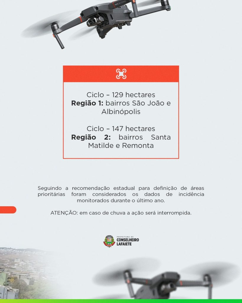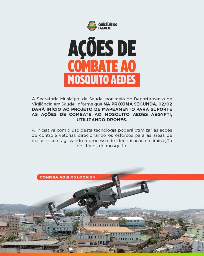 A Secretaria Municipal de Saúde iniciou o mapeamento com drones para reforçar as ações de combate ao mosquito Aedes aegypti em áreas prioritárias do município. A tecnologia permite identificar focos de difícil acesso, direcionar esforços para regiões de maior risco e tornar o controle vetorial mais ágil e eficiente. A ação integra uma estratégia baseada em dados de monitoramento, ampliando a prevenção e protegendo a saúde da população. Em caso de chuva, a operação poderá ser interrompida. Faça sua parte: reserve alguns minutos por semana para eliminar possíveis criadouros em casa