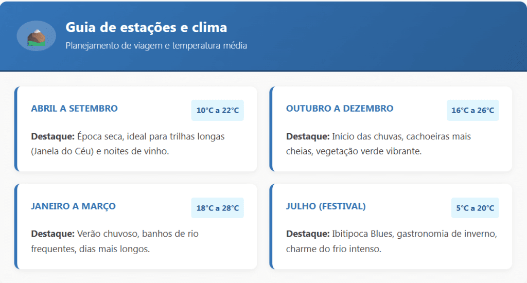 O clima de montanha dita o ritmo das visitas, com estações bem marcadas pela altitude da vila, que gira em torno de 1.100 metros. Essa elevação garante frescor constante, mas também exige preparação para o frio. A temperatura mais baixa registrada recentemente foi de 0 °C em agosto de 2024, cobrindo a paisagem com geada.