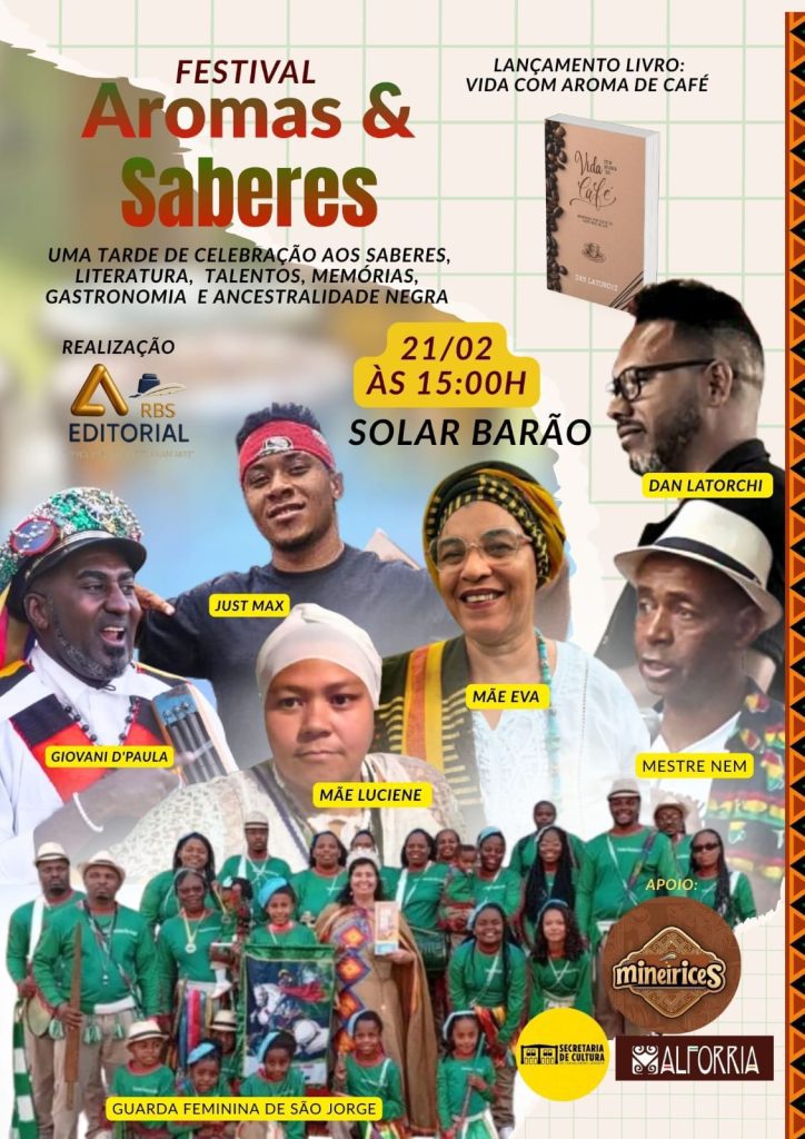 Lafaiete recebe neste sábado, 21 de fevereiro, às 15h, o Festival Aromas & Saberes, um encontro que propõe uma imersão nos saberes, nas memórias e na riqueza da cultura negra.O evento será realizado no Solar Barão, na Rua Barão de Suaçuí, reunindo literatura, música, espiritualidade e gastronomia em uma mesma experiência. A realização é da RBS Editorial, responsável por conduzir uma proposta que valoriza a cultura, a identidade e o encontro entre diferentes trajetórias. A programação destaca nomes que carregam história e representatividade, como Mãe Eva, Mãe Luciene, Mestre Nem, Giovani D’Paula e Just Max, além da presença da Guarda Feminina de São Jorge, fortalecendo a conexão com a ancestralidade e as tradições afro-brasileiras.