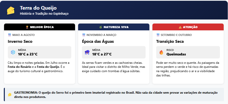 O Serro possui um clima tropical de altitude, marcado por invernos secos e verões chuvosos. A cidade é famosa mundialmente pelo seu queijo e pela Festa do Rosário. O clima fresco da montanha é um convite ao turismo histórico e gastronômico. Confira o planejamento: