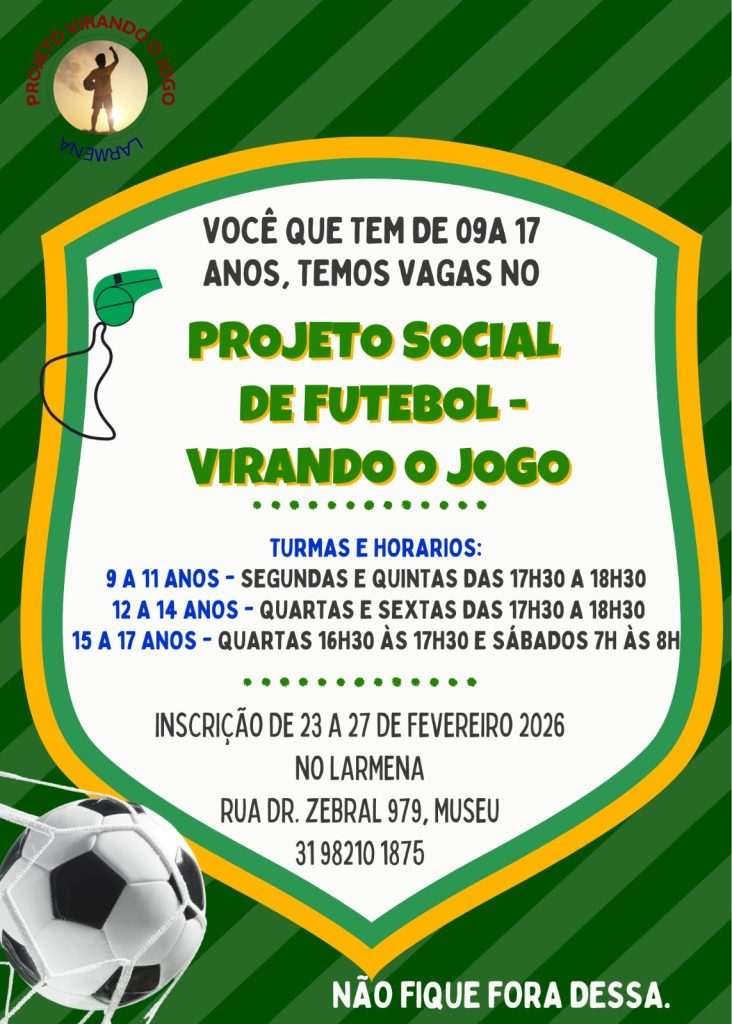 Em tempos em que tantos jovens precisam de oportunidade, acolhimento e direção, um projeto social em Conselheiro Lafaiete mostra que o esporte pode ser muito mais que competição. Pode ser caminho. Pode ser escolha. Pode ser futuro.O Projeto Social Virando o Jogo, desenvolvido pela instituição Larmena, está com inscrições abertas de 23 a 27 de fevereiro para vagas remanescentes e cadastro de reserva.A iniciativa é totalmente gratuita e voltada exclusivamente para estudantes de escolas públicas.