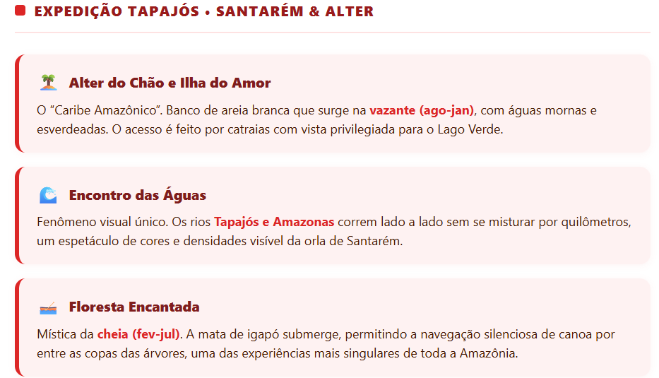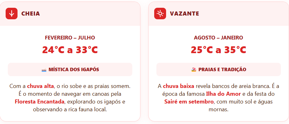 Santarém tem dois períodos bem distintos. Na cheia (fevereiro a julho), as praias desaparecem, mas a Floresta Encantada fica navegável. Na vazante (agosto a janeiro), as areias brancas surgem e o cenário das praias atinge seu auge.