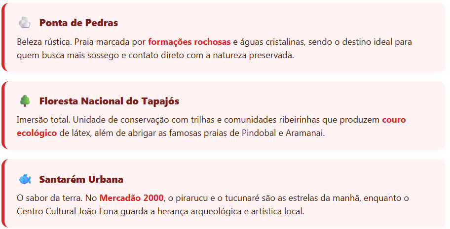 O apelido Pérola do Tapajós traduz bem o que o visitante encontra: uma combinação rara de praias fluviais, igapós, comunidades ribeirinhas e uma gastronomia marcada pelos peixes de rio e pelas frutas da floresta. O Portal de Turismo da Prefeitura de Santarém lista dezenas de atrativos espalhados entre a zona urbana e os distritos.