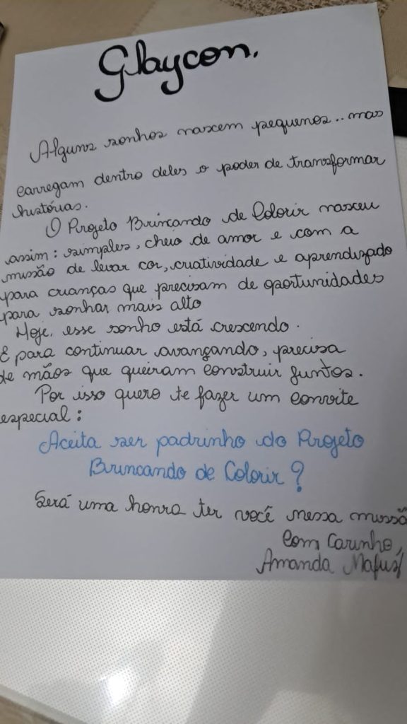 Entre lápis de cor espalhados sobre a mesa verde, desenhos ganhando vida e crianças concentradas em cada traço, o domingo, 1º de março, no bairro Cachoeira, em Conselheiro Lafaiete, guardou um momento especial.Durante as atividades do Rua Viva, a responsável pelo projeto social Brincando de Colorir entregou a Glaycon Franco uma carta escrita à mão. Um convite simples, direto e cheio de significado: aceitar ser padrinho da iniciativa