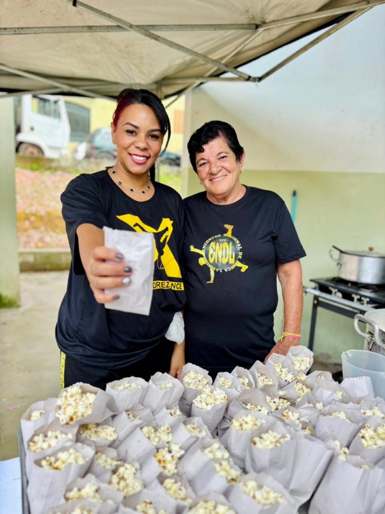 O domingo, 1º de março, ganhou cores, risadas e cheiro de pipoca espalhado pelo ar. O Rua Viva, realizado no Centro Comunitário dos Moradores do Bairro Cachoeira, que cedeu gentilmente o espaço para o evento, virou ponto de encontro de famílias de toda Lafaiete. Veio gente do Siderúrgico, do Lima Dias, do São Benedito, do Areal e de muitos outros cantos da cidade. O espaço coberto ficou completamente tomado. Crianças disputavam pipoca ainda quentinha, corriam para os brinquedos infláveis como se estivessem entrando em um parque de diversões e voltavam com o sorriso impossível de esconder. O algodão doce coloria as mãos e deixava a tarde ainda mais doce. E os brindes. Foram muitos. Sacolas, lembranças, pequenos presentes distribuídos ao longo da programação fizeram a alegria da garotada. E dos adultos.