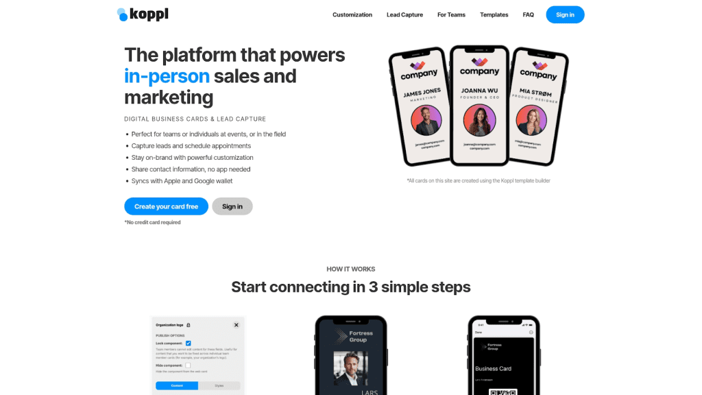 KopplcardUS$ 6/mêsCartões NFC, assinaturas de e-mail, sincronização de contatosEquipes corporativasiOS/Android/Web