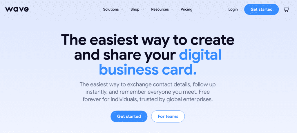 Wave ConnectGratuito (PRO por US$ 7/mês)QR codes, Apple/Google Wallet, contatos ilimitados, integração com CRMProfissionais e equipes que precisam de gestão completa de contatosiOS/Android/Web