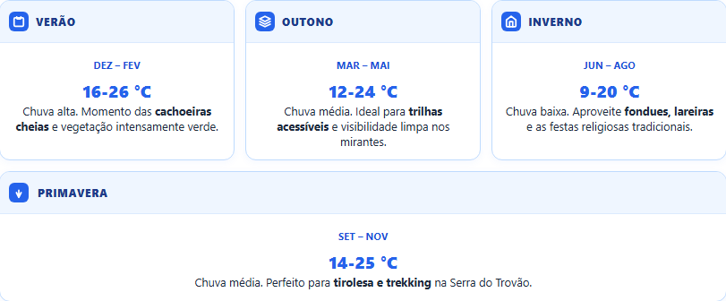A altitude acima de 1.200 metros garante temperaturas amenas o ano inteiro. No inverno, os termômetros podem cair abaixo de 10 °C. Mesmo no verão, noites frescas pedem agasalho.