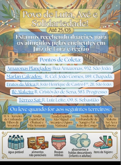 Terreiros de religiões de matriz africana e integrantes do Movimento Negro Frutos da África estão mobilizados em Conselheiro Lafaiete para arrecadar doações destinadas às famílias atingidas pelas fortes chuvas em Juiz de Fora e cidades da região. A campanha solidária destaca o papel histórico dos terreiros como espaços de acolhimento, cuidado e solidariedade dentro das comunidades. Com o lema “Povo de Luta, Axé e Solidariedade”, a iniciativa busca reunir itens essenciais que muitas vezes são esquecidos em campanhas emergenciais.