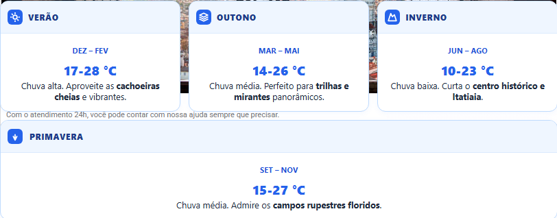 A altitude ameniza o calor do interior mineiro. O inverno seco é a melhor época para trilhas e mirantes, enquanto o verão traz chuvas fortes que alimentam as cachoeiras.