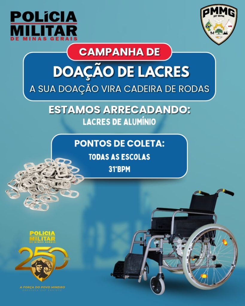 A Polícia Militar de Minas Gerais, por meio do 31º Batalhão da Polícia Militar, está promovendo uma campanha solidária de arrecadação de lacres de alumínio, com o objetivo de transformar as doações em cadeiras de rodas destinadas a pessoas que necessitam.A iniciativa busca mobilizar a comunidade para contribuir com algo simples, mas que pode gerar grande impacto social. Os lacres de latinhas de alumínio arrecadados serão encaminhados para reciclagem e o valor obtido será revertido na aquisição de cadeiras de rodas.
