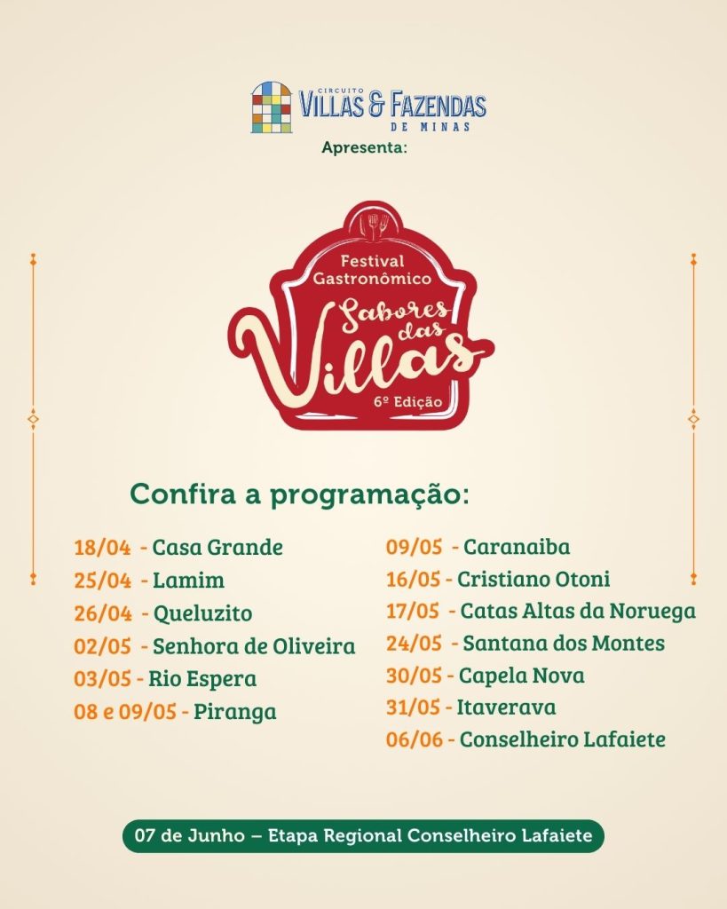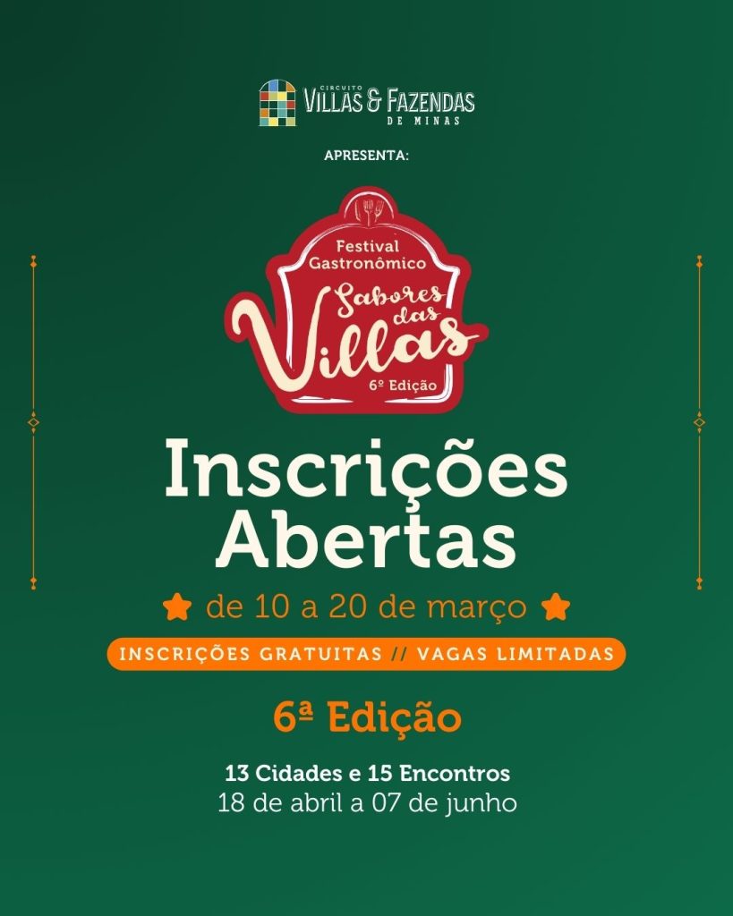 O Festival Gastronômico Sabores das Villas, considerado o maior festival gastronômico de Minas Gerais, chega à sua 6ª edição em 2026, celebrando a riqueza da culinária regional e valorizando ingredientes, saberes e tradições dos municípios que integram o Circuito Turístico Villas e Fazendas de Minas.