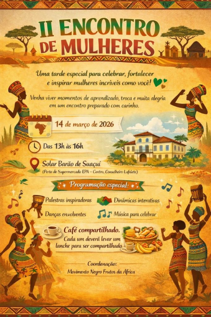 Lafaiete se prepara para viver uma tarde marcada por diálogo, celebração e fortalecimento feminino. Nesse sábado, 14 de março de 2026, o histórico Solar Barão de Suaçuí, no centro da cidade, será palco do II Encontro de Mulheres do Movimento Negro Frutos da África, iniciativa que busca valorizar trajetórias, compartilhar saberes e reafirmar o protagonismo das mulheres na construção da sociedade.O encontro acontecerá das 13h às 16h e promete reunir mulheres de diferentes histórias, idades e experiências em um ambiente de acolhimento, reflexão e alegria. A proposta do evento é simples e poderosa ao mesmo tempo: celebrar, fortalecer e inspirar mulheres, criando um espaço de escuta, aprendizado e troca.