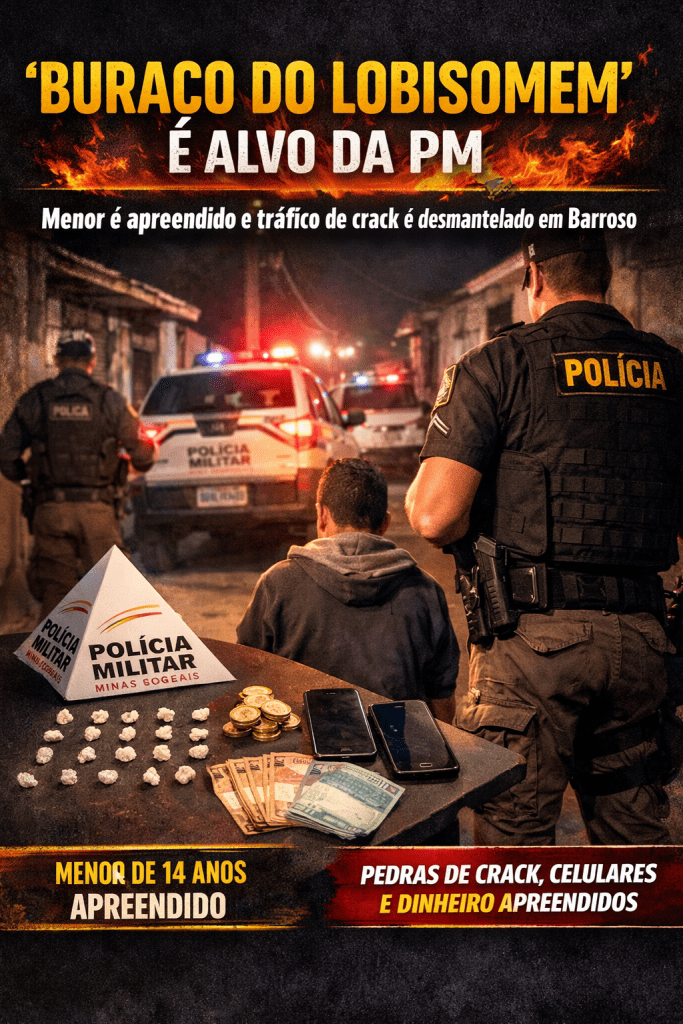 Uma operação da Polícia Militar de Minas Gerais resultou na apreensão de drogas, dinheiro e na atuação direta contra o tráfico na noite de quarta-feira (18), em Barroso. A ação foi realizada pelo 38º BPM no bairro Praia, em um ponto já conhecido por denúncias, popularmente chamado de “Buraco do Lobisomem”. Segundo informações, o local vinha sendo utilizado para a comercialização de crack, com movimentação intensa de usuários.
