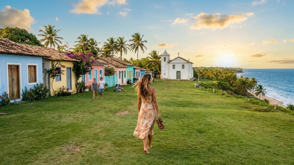 No alto de uma colina com vista para o oceano, casinhas coloridas cercam um gramado largo que termina numa igrejinha branca. Atrás dela, o mirante abre para o azul do mar e os coqueirais da Praia dos Coqueiros. Esse é o Quadrado de Trancoso, coração de um vilarejo no litoral sul da Bahia que nasceu como posto de catequese jesuíta e ficou isolado do resto do país até a década de 1970.