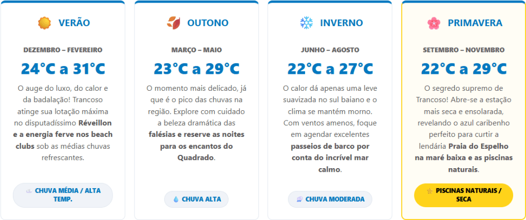 Temperaturas aproximadas com base no Climatempo (Porto Seguro, cidade-base). Condições podem variar.