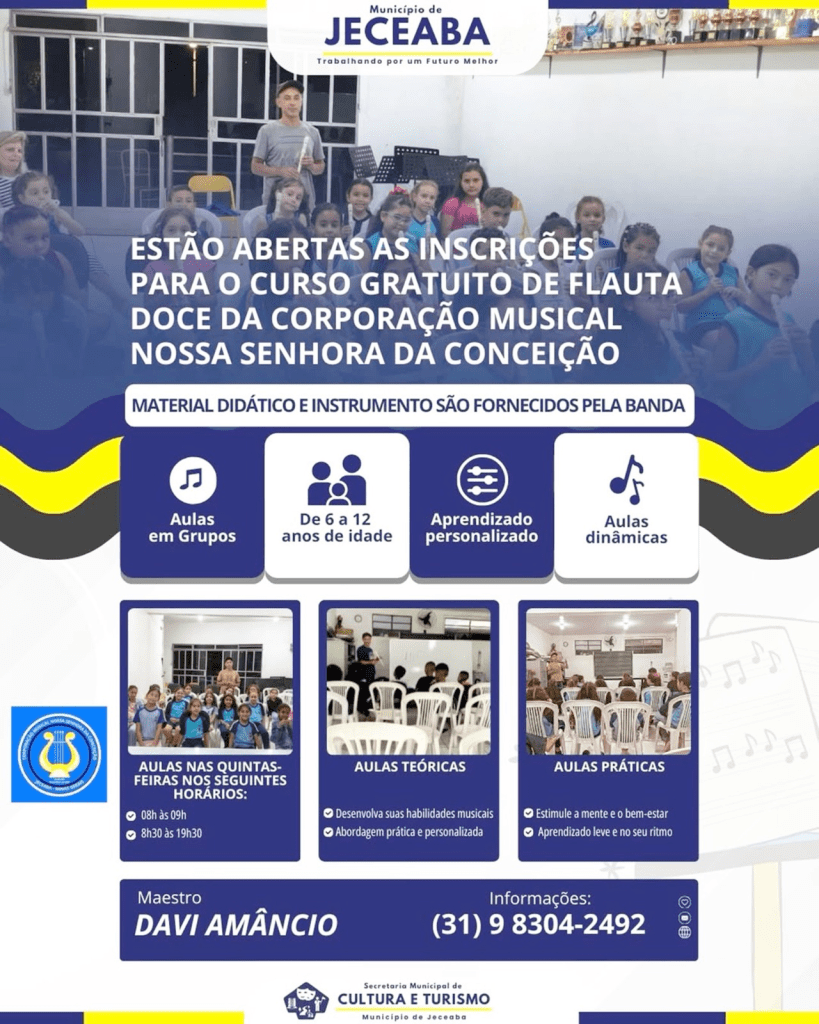 A Corporação Musical Nossa Senhora da Conceição oferece o Curso de Flauta Doce, idealizado pelo maestro Davi Amâncio, com o objetivo de inserir crianças no universo da musicalização e revelar novos talentos para a banda do município.