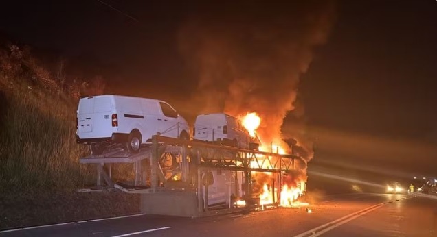 Um incêndio assustou motoristas que passavam pela BR-040, em Juiz de Fora, neste domingo (22).De acordo com o Corpo de Bombeiros Militar de Minas Gerais, a carroceria de uma carreta-cegonha foi tomada pelas chamas enquanto trafegava pela rodovia. O motorista conseguiu agir rapidamente e desengatar o cavalo mecânico, evitando que o fogo se alastrasse ainda mais.O incêndio teve início na parte traseira da carroceria e atingiu três dos cinco veículos que estavam sendo transportados, todos do tipo furgão, além de causar danos à própria estrutura da carreta.