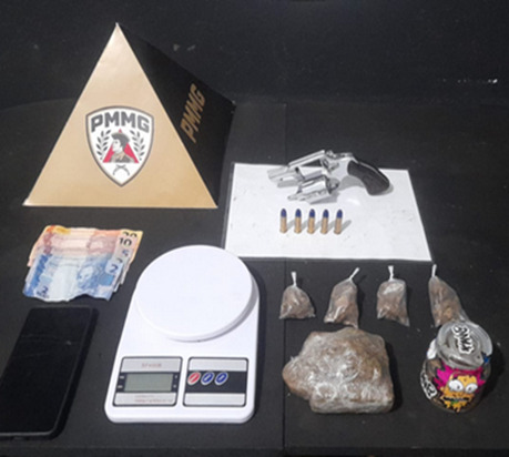 Foram apreendidos um revólver calibre .38 com cinco munições, uma barra, quatro buchas e uma porção de substância semelhante à maconha, além de uma balança de precisão, um aparelho celular e R$ 39 em dinheiro.