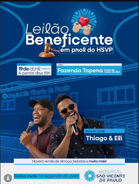 No dia 19 de abril, a Fazenda Tapera abre as porteiras para um grande Leilão Beneficente em prol do Hospital São Vicente de Paulo, prometendo um dia especial de solidariedade, alegria e união para toda a família. Mais do que um simples evento, a iniciativa será uma verdadeira festa, com show ao vivo da dupla Thiago e Eli, além de um almoço delicioso e salgados preparados com capricho para receber o público. A proposta é reunir amigos e famílias em um ambiente descontraído, onde todos são bem-vindos — seja chegando a cavalo, de bicicleta ou até mesmo a pé.