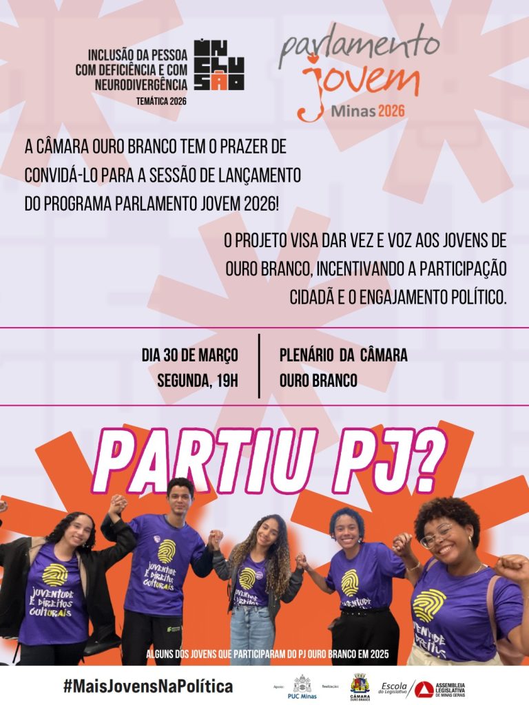A cidade de Ouro Branco se prepara para dar início a mais uma importante jornada de formação cidadã. Na próxima segunda-feira, dia 30 de março, às 19h, o Plenário da Casa Legislativa será palco do lançamento oficial do Parlamento Jovem 2026, reunindo estudantes, educadores e representantes de escolas do município.