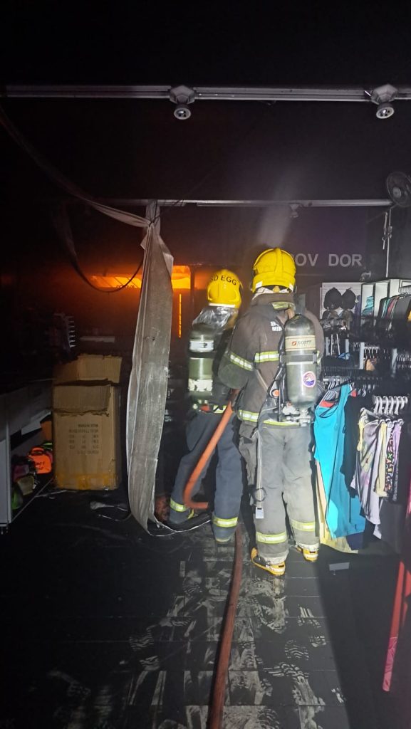 Ao chegarem ao local, os militares realizaram a avaliação inicial e confirmaram o foco das chamas na área indicada. Para conter o incêndio, foram montadas duas linhas de combate, com o uso de quatro mangueiras. Ao todo, aproximadamente 10 mil litros de água foram utilizados até a completa extinção do fogo.Após controlar as chamas, os bombeiros iniciaram o trabalho de rescaldo e resfriamento, evitando novos focos. Apesar do incêndio não ter atingido diretamente as roupas expostas na área de vendas, os produtos acabaram danificados pela fuligem.
