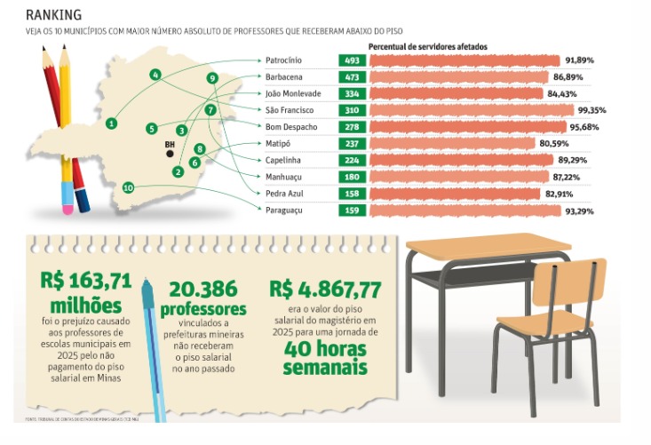 Com o reajuste de 5,4% em 2026, o piso nacional do magistério passou a ser de R$ 5.130,63.O TCE-MG informou que pretende intensificar a fiscalização para garantir o cumprimento da lei, enquanto sindicatos seguem cobrando a valorização da categoria.Por outro lado, gestores municipais alegam dificuldades financeiras para adequar os salários ao piso nacional.