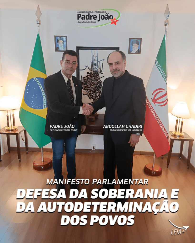 O deputado federal Padre João (PT-MG) foi recebido pelo embaixador do Irã no Brasil, Abdollah Nekounam Ghadiri, para debater soberania, autodeterminação dos povos e caminhos de paz diante dos conflitos internacionais.