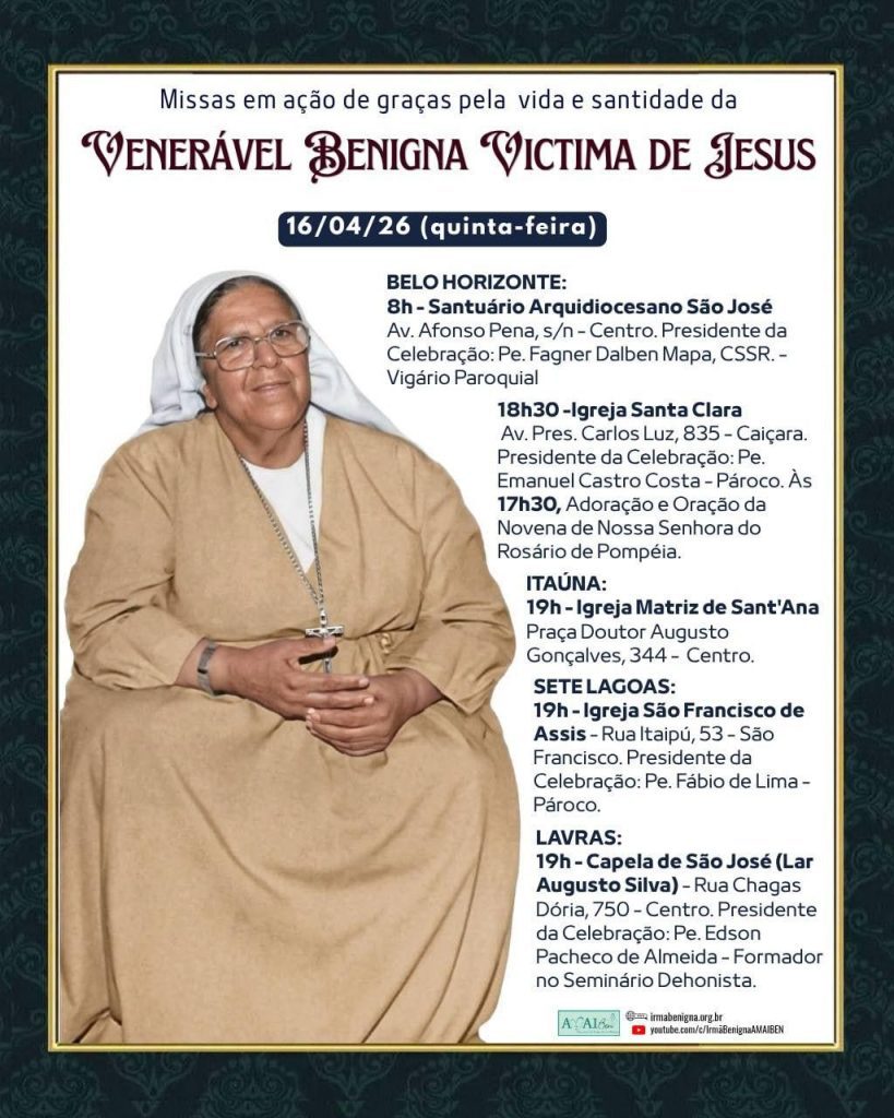 No dia 16 de abril (quinta-feira), teremos as Missas em ação de graças pela vida e santidade da Venerável Benigna Victima de Jesus em Belo Horizonte, Itaúna, Sete Lagoas e Lavras. Em Belo Horizonte, a primeira Celebração Eucarística acontecerá no Santuário Arquidiocesano São José (Av. Afonso Pena, s/n – Centro), às 8h, presidida pelo Missionário Redentorista, Pe. Fagner Dalben Mapa, Vigário Paroquial. À noite, ainda na capital mineira, a Santa Missa será celebrada na Igreja Santa Clara (Av. Pres. Carlos Luz, 835 – Caiçara), presidida pelo Pároco, Pe. Emanuel Castro Costa. Antes da Missa, às 17h30, haverá Adoração e Oração da Novena de Nossa Senhora do Rosário de Pompéia.
