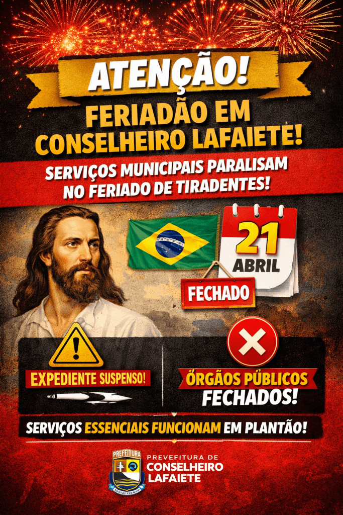 A Prefeitura de Conselheiro Lafaiete anunciou mudanças no funcionamento dos serviços públicos municipais durante o feriado de Tiradentes.De acordo com o comunicado, segunda-feira (20) será ponto facultativo, enquanto na terça-feira (21), data do feriado nacional, não haverá expediente nas repartições públicas. Com isso, órgãos administrativos, escolas municipais e postos de atendimento ao cidadão terão suas atividades suspensas durante o período, seguindo o calendário oficial. Durante esses dias, os serviços considerados não essenciais permanecerão fechados.