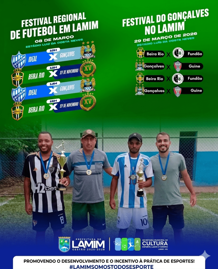 A Prefeitura de Lamim, através da Secretaria Municipal de Cultura, Esporte, Lazer e Turismo (Gestão 2025-2028), promoveu com grande êxito eventos esportivos marcantes no Estádio Luiz da Costa Neves durante o mês de março, reafirmando seu compromisso com o desenvolvimento e o incentivo à prática de esportes na cidade.