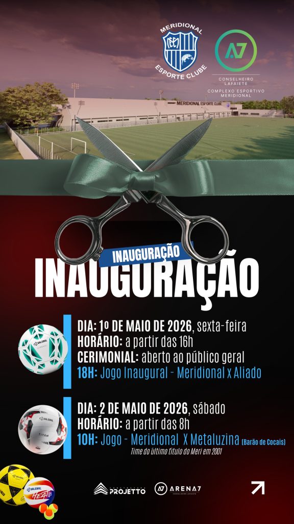 O esporte de Conselheiro Lafaiete está prestes a viver um momento histórico. Após quase três anos de obras, o Meridional Esporte Clube realiza, nos dias 1º e 2 de maio de 2026, a inauguração oficial do seu novo complexo esportivo, um dos mais modernos do interiro de Mins, em parceria com a Arena 7 Lafaiete. A programação promete movimentar a cidade com cerimônia aberta ao público e grandes jogos comemorativos.