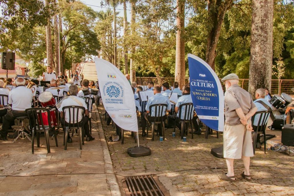 Fundada em 1969, a Sociedade Musical Nossa Senhora d’Ajuda, sediada no distrito do Alto Maranhão, levou ao público um repertório diversificado e momentos de emoção. Durante a apresentação, o maestro Robson prestou uma homenagem ao senhor Davi de Oliveira, integrante que celebra 20 anos de dedicação à banda.